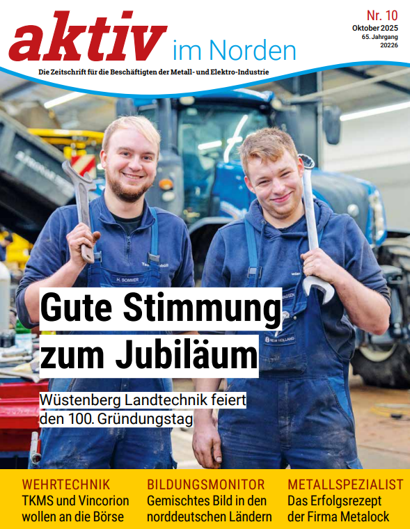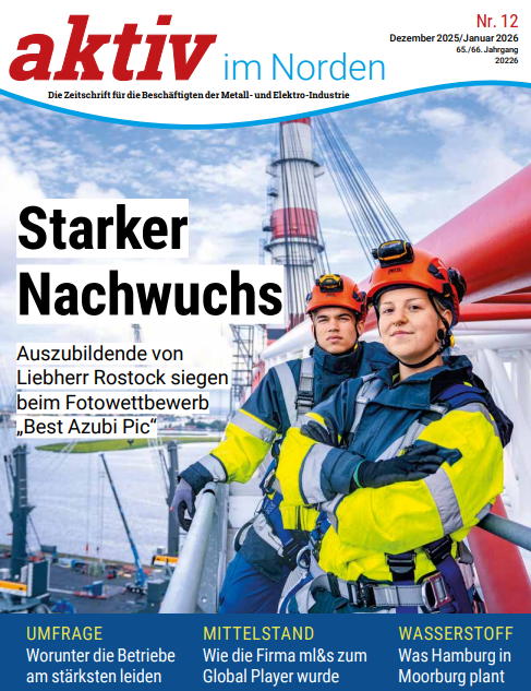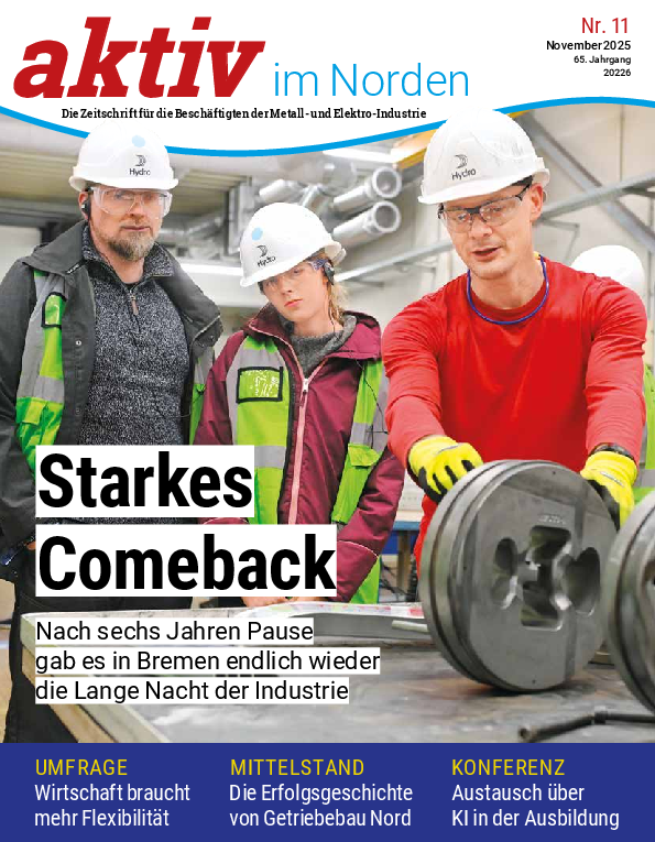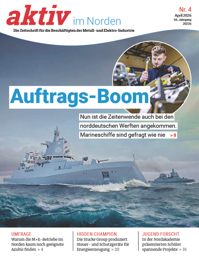 aktiv im Norden ist die Zeitschrift für die Beschäftigten der norddeutschen Metall- und Elektroindustrie - ein exklusiver Service für die Beschäftigten unserer Mitgliedsunternehmen. Wir berichten über spannende Unternehmen, interessante Mitarbeiterinnen und Mitarbeiter, Neuigkeiten aus der Industrie und bieten Infos aus der Region - ansprechend getextet und bilderreich präsentiert.