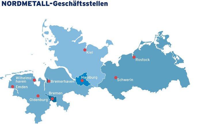 Für NORDMETALL steht die persönliche Beratung seiner Mitglieder im Vordergrund. Die Betreuung vor Ort gewährleisten wir durch unsere Geschäftsstellen in Bremerhaven, Bremen, Emden, Hamburg, Kiel, Oldenburg, Rostock, Schwerin und Wilhelmshaven.